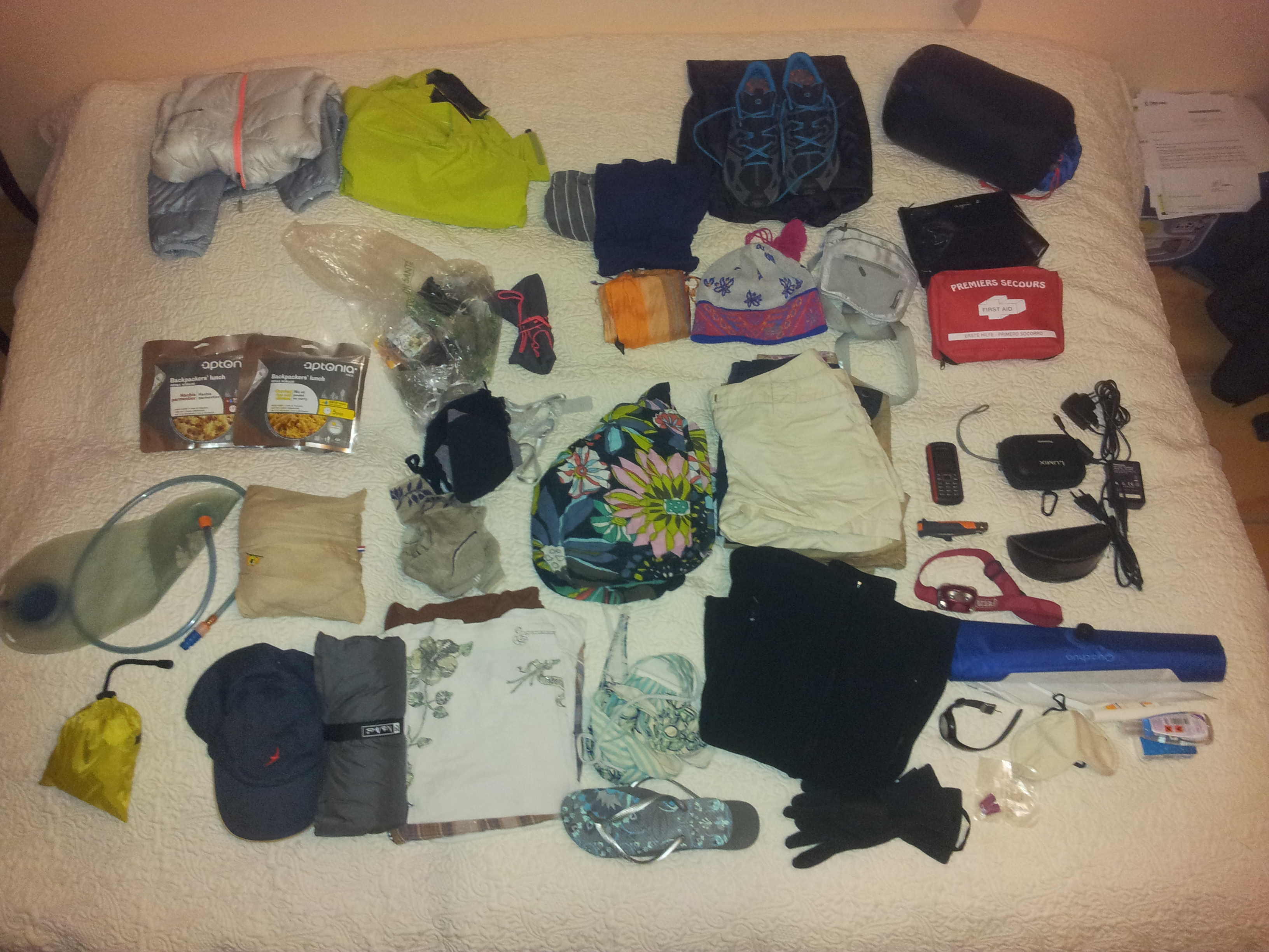 Heureusement pour nous, les expériences des précédents voyageurs sur Internet et les conseils avisés du Vieux Campeur nous ont bien orientés. Aussi, voici la liste des équipements que nous avons décidé d’amener avec nous (après mûre réflexion).